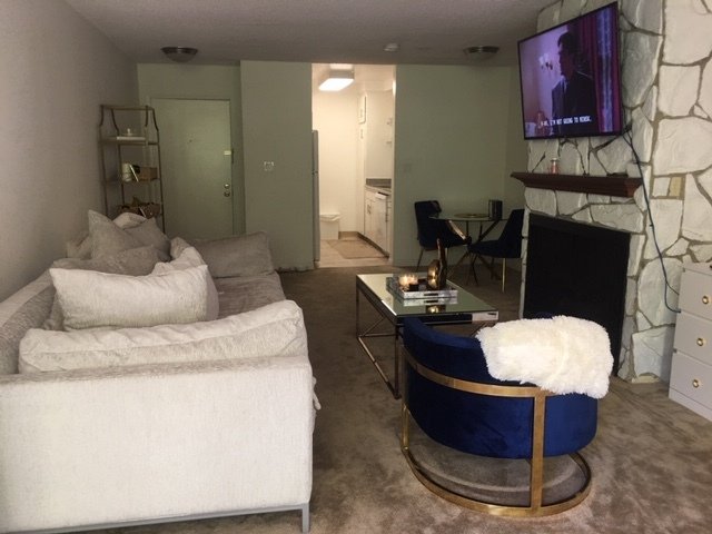 Spacious bright one bedroom + one-bathroom corner unit with windows in the bathroom facing east. Carpeted and ample closet storage. Quiet balcony facing the back of the building. Window Coverings, Air Conditioner, Fireplace, Refrigerator, Electric Range, Dishwasher, Microwave, Disposal, Cable &; Satellite Ready.