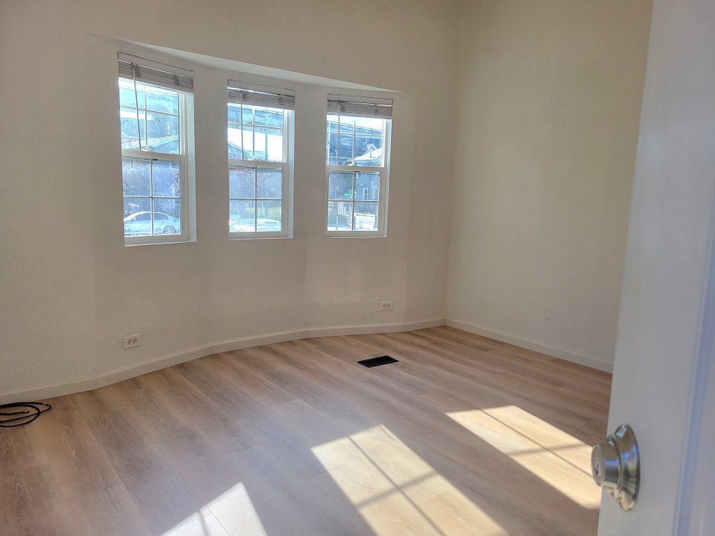 Three bedrooms and an open-concept living room. Two bedrooms share a Jack and Jill bath. The back bedroom has its own private entrance, great for a home office or a roommate who keeps different hours. Washer and dryer inside. Quartz countertops, gas range, and real counter space. LVP floors through the bedrooms and living room.