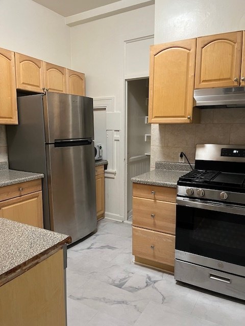 Stainless Steel Appliances: Refrigerator, Dishwasher, and Stove/Oven.
