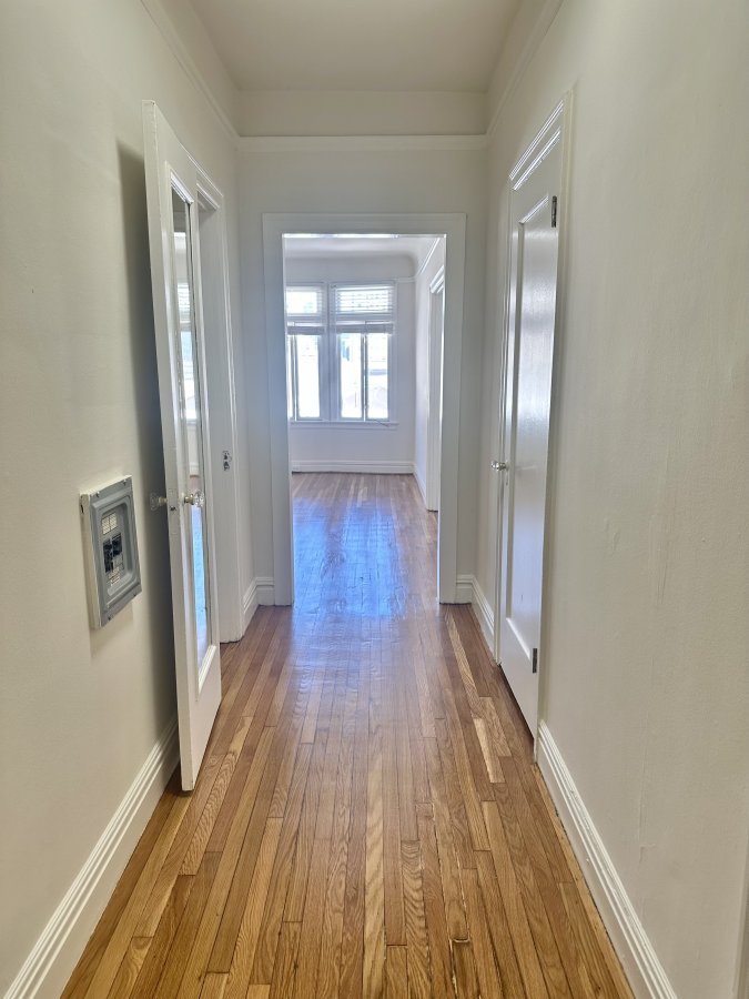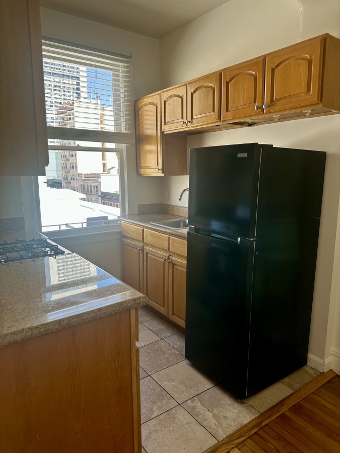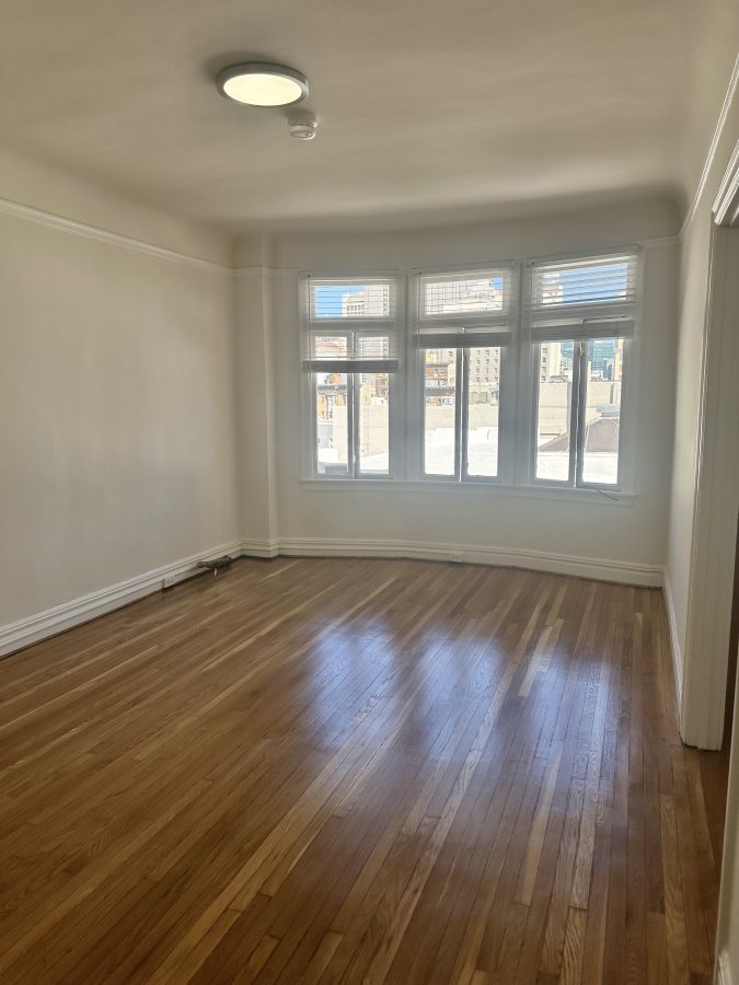 This top floor studio unit has beautiful layout with great views of downtown. The sleek kitchen boasts a small eating nook with original built-in shelving. Hardwood floors run throughout, adding warmth and sophistication, while the spacious walk-in closet provides ample storage. Situated in the vibrant Tenderloin district, you'll enjoy easy access to local shops, restaurants, and public transportation, making city living both convenient and exciting.