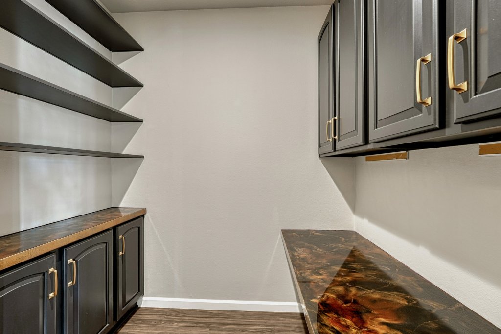 The gourmet kitchen features marble-inspired counters, designer backsplash, stainless steel appliances, gas range, and a butler’s pantry with wet bar. Flowing seamlessly into the dining and living areas, the home is perfect for entertaining or enjoying quiet evenings by the fireplace.
