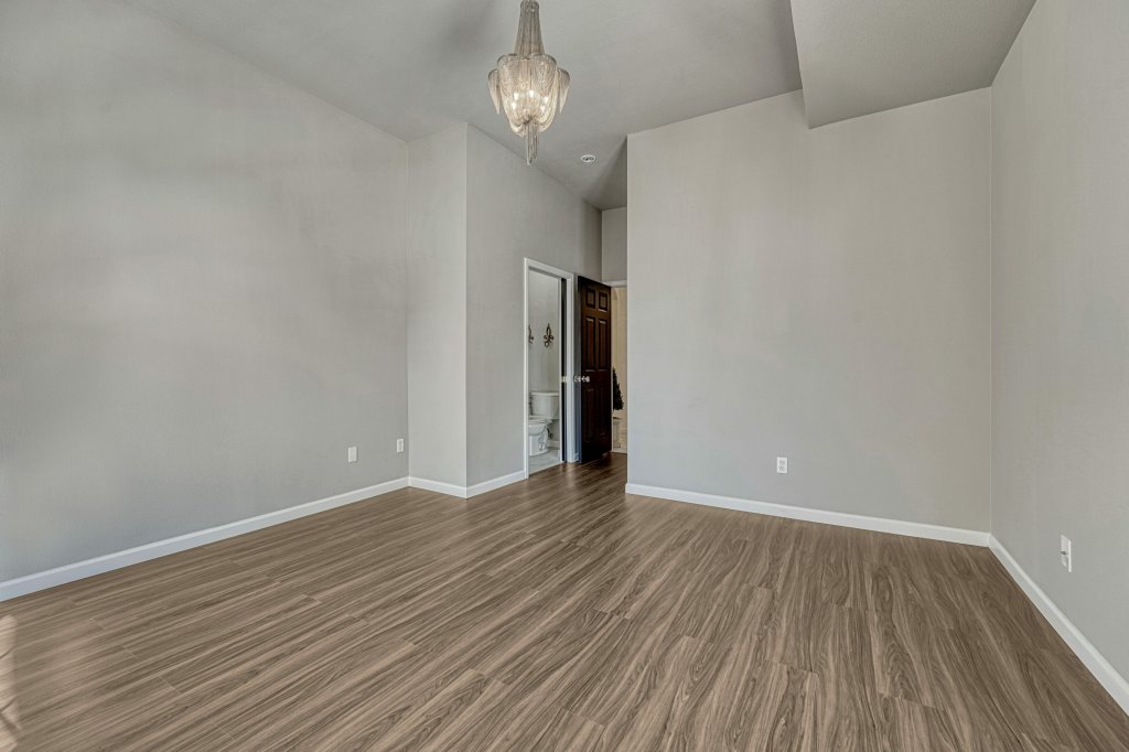 The primary suite includes its own balcony, a generous walk-in closet, and a spa-inspired bathroom with dual vanities, soaking tub, and separate shower wrapped in stone finishes. A second bedroom, full bath, and versatile layout provide options for guests or a home office.