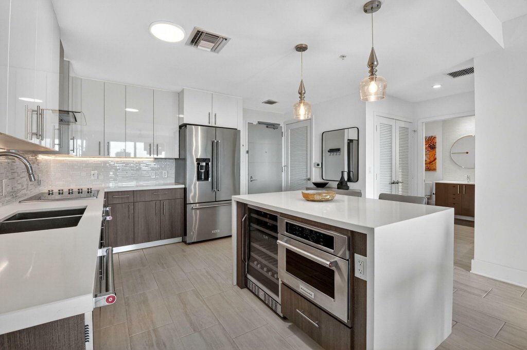 4 months min. Live a resort style lifestyle in the heart of downtown Delray Beach in this penthouse level 1 bedroom residence. This newer boutique building offers the rare blend of private condo living with shared Aloft Hotel amenities, creating a true year round vacation feel. Enjoy ocean glimpses from the oversized private balcony and designer finishes throughout. The open concept kitchen features a quartz waterfall island, two tone cabinetry, mosaic backsplash, KitchenAid appliances, and a wine refrigerator. Residents enjoy access to the Aloft resort pool, fitness center, restaurant, and bar, plus concierge service and a private residents only club room with wine lockers. Covered garage parking and private storage included. Two blocks to Atlantic Avenue and 1.1 miles to the beach.