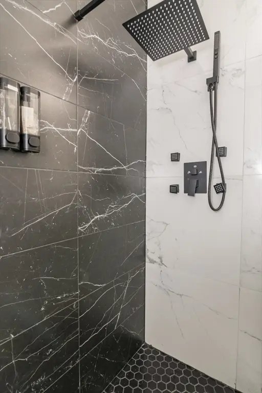 Two full bathrooms, each featuring marble tile, contemporary vanities, and rainfall showerheads for a spa-like feel