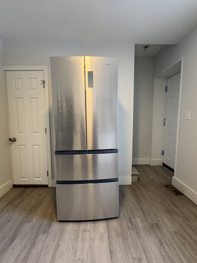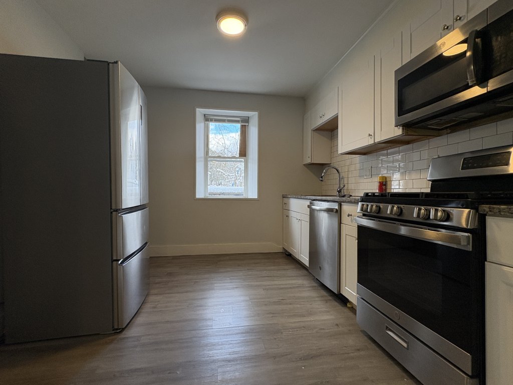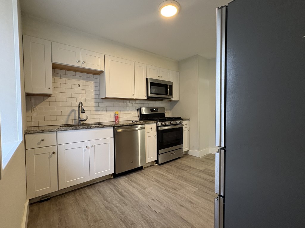 This renovated unit features a modern kitchen with stainless steel appliances, including a full-size refrigerator, electric range/oven, and high-efficiency dishwasher. You'll also enjoy the convenience of in-unit laundry with a washer and dryer included.