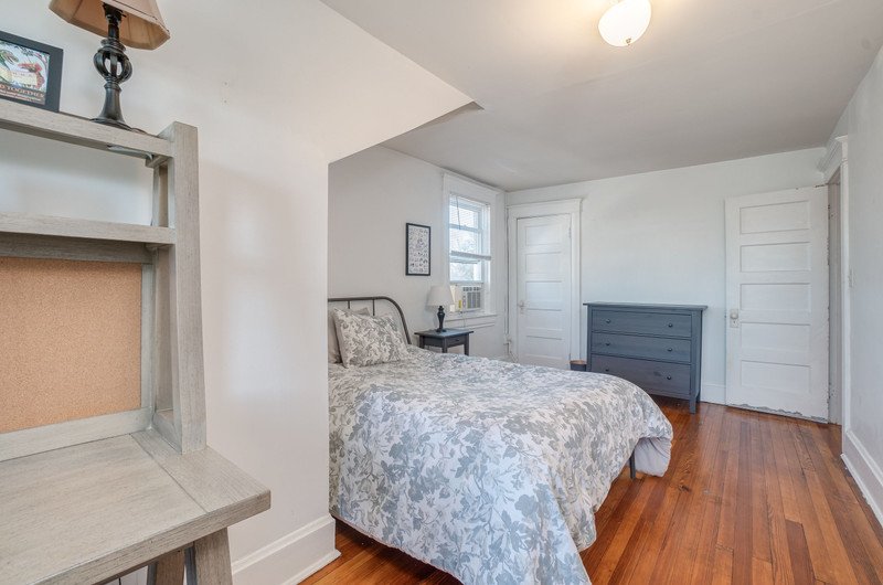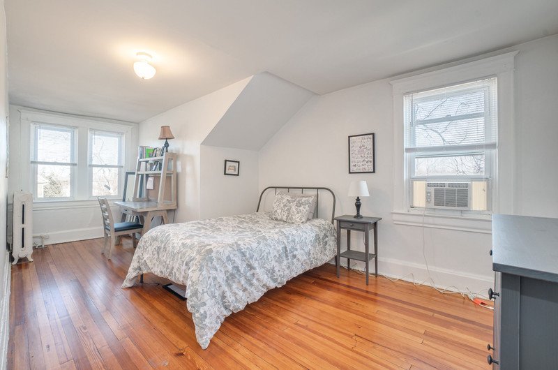 The apartment is the top floor unit in a three unit building and is approximately 978 square feet. It has an entrance that is shared with only one other unit. Unfurnished.