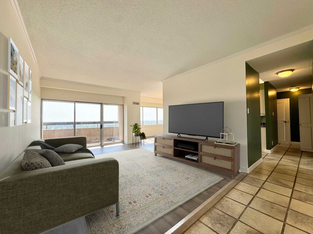 This spacious 1-bedroom, 1-bath condo is on the 28th floor with a private patio overlooking the Kansas City skyline. Unit features slate-style tile and carpet, built-in bookshelves in the living room and bedroom, an in-unit washer and dryer, plus an updated kitchen with granite countertops and stainless-steel appliances. Garage parking available!