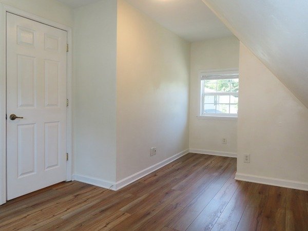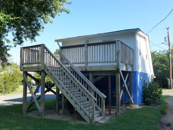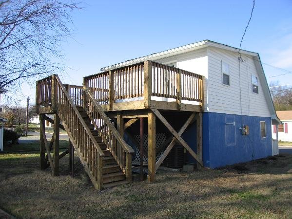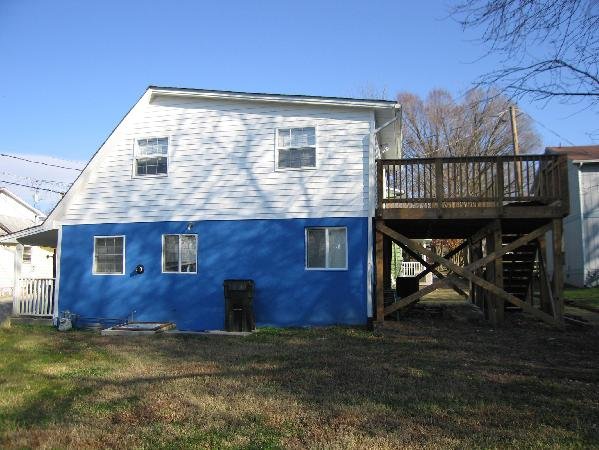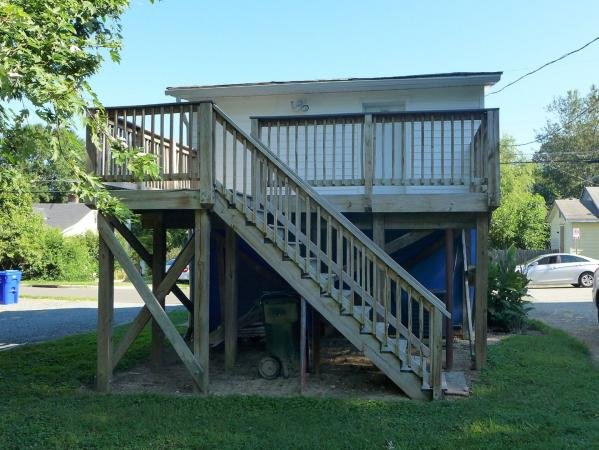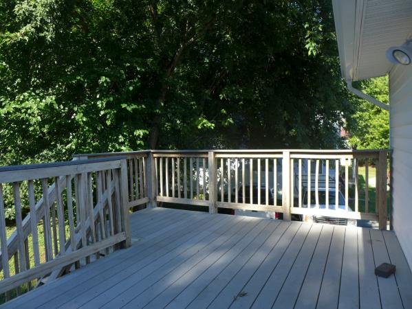 A large raised deck is off the back of the house, accessed from the second level. The deck leads out to the back yard. There is shared parking to the side of the house (Three spaces in parking area reserved for non-tenant vehicles and are not available for tenant use.)