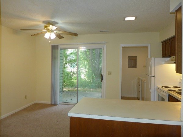 This townhome has an open floor plan with carpet and a wood-burning fireplace in the living room. The living area is open to the eat-in kitchen. The kitchen includes appliances. A glass slider leads from the kitchen to the patio in back. A washer and dryer are also included.