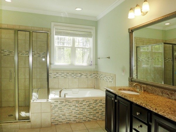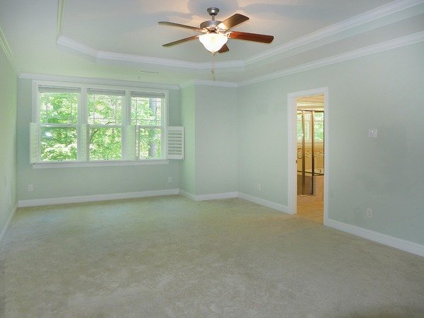 The bedrooms are on the upper two levels, all with carpet. Three bedrooms are on the second level. The master bedroom features a trey ceiling with a fan, plantation shutters, and an en suite master bathroom. The master bathroom has a dual sink vanity, a soaker tub, a separate shower with tile surround, and a large walk in closet. A second bathroom and the laundry room are on this level. The laundry room has built-in cabinets, a closet, and washer-dryer hook-ups. The fourth bedroom with a walk-in closet and the third bathroom are on the third level. This spacious room could be used as a bonus. The bathroom has a tile shower. There access to attic storage from this level of the home. All of the bathrooms and the laundry room have tile flooring.