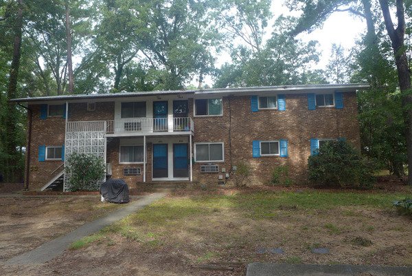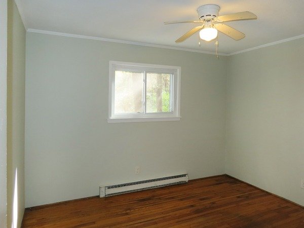 Walk to Carrboro, bike or bus to campus from this ground level apartment in a quadplex. This unit has hardwood floors in the combined living and dining area, and the bedrooms. Furnishing can define the living and dining space. There is a ceiling fan in this room. A door leads out from this room to the storage closet and area behind the building.