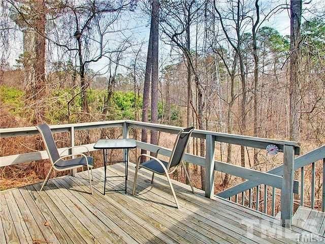 The kitchen has a refrigerator that will remain as will the washer and dryer. There is a huge storage closet on the first floor. There is a back deck that is surrounded by woods and very private.