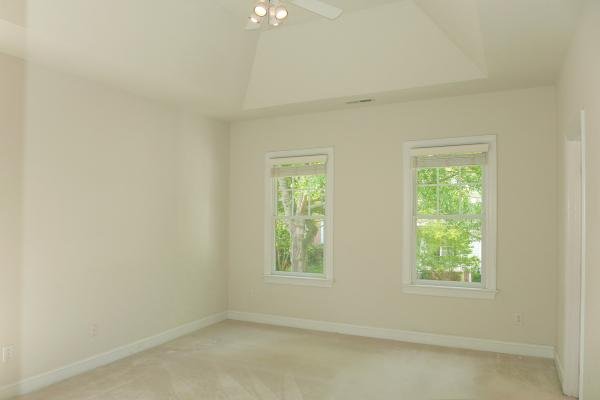 The bedrooms are on the second level. All of the bedrooms have carpet. The master bedroom features a vaulted style trey ceiling with a fan, a walk-in closet and a private master bathroom. The master bathroom includes a dual sink vanity, a garden tub, and a separate shower. There is a second full bathroom on this level of the home. The laundry closet is also on the second level and includes a washer and dryer.