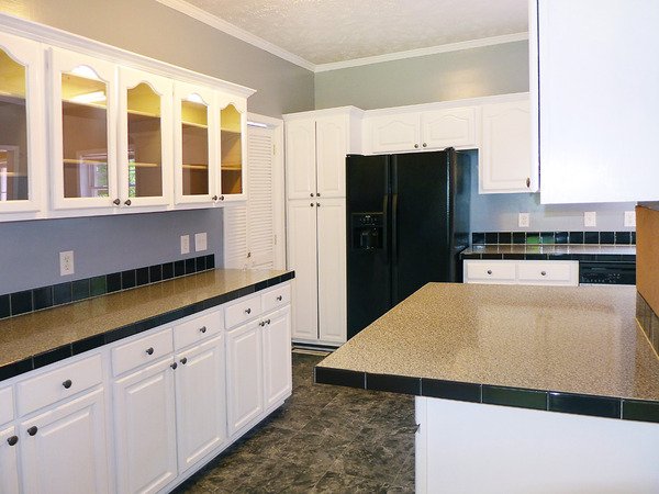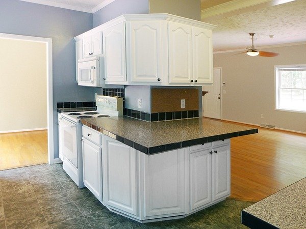 The living room is open to the dining room, both with hardwood floors. There is a ceiling fan and a decorative [not for use] fireplace in the living room. A glass slider leads from the dining room to the back deck. The kitchen features white cabinets - including glass front lighted cabinets and tile-trim counter tops. Kitchen appliances are included. The laundry space is just off of the kitchen with washer and dryer hook-ups. There is a closet in this room which could serve as a pantry closet. This also provides a rear exit to the deck.