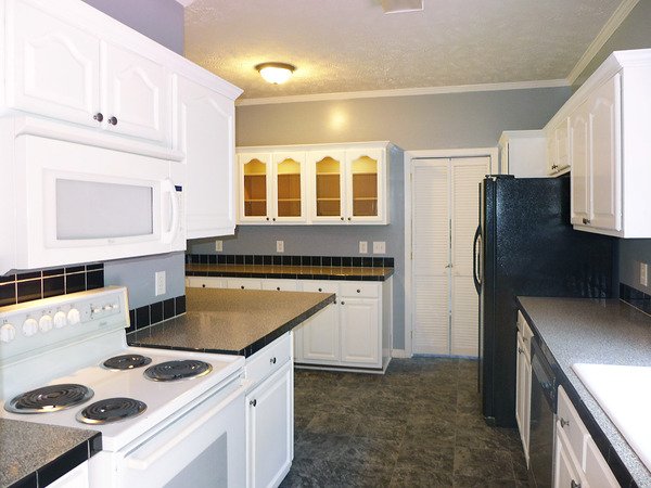 The living room is open to the dining room, both with hardwood floors. There is a ceiling fan and a decorative [not for use] fireplace in the living room. A glass slider leads from the dining room to the back deck. The kitchen features white cabinets - including glass front lighted cabinets and tile-trim counter tops. Kitchen appliances are included. The laundry space is just off of the kitchen with washer and dryer hook-ups. There is a closet in this room which could serve as a pantry closet. This also provides a rear exit to the deck.