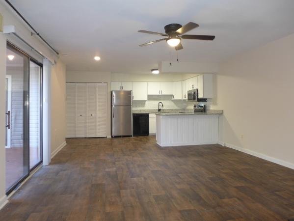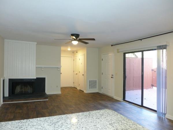This updated home has a private fenced courtyard deck entry. The open floor plan includes the combined living and dining areas and the kitchen, all with hardwood style plank flooring. The living area features a ceiling fan, and a corner fireplace with a panel accent wall and a slate hearth. There is a slider from the living room to the courtyard. The kitchen features granite counter tops, white cabinets, and a subway tile backsplash. An oversized serving or breakfast counter separates the kitchen from the living room. Kitchen appliances are included. A washer and dryer are also included and located in the closet in this common space.