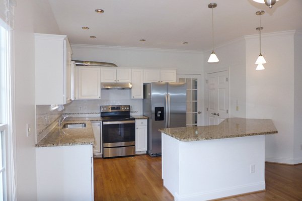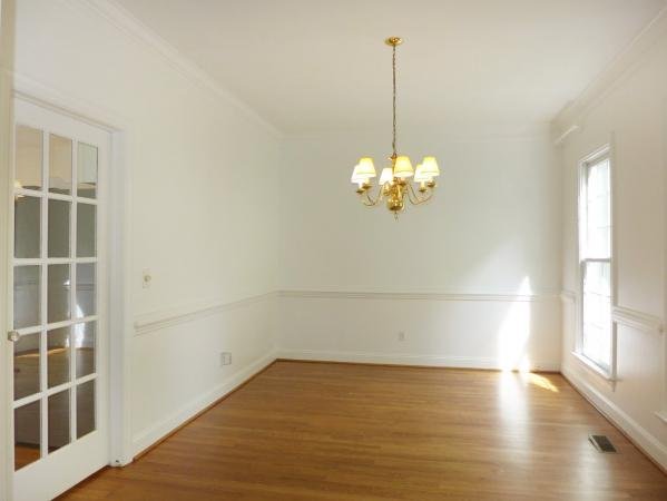 This home features hardwood floors throughout. The transitional floor plan includes the open living room, kitchen and breakfast area. The living room includes a ceiling fan and has an exit to the screened porch on the back side of the home. This space is open to breakfast area and the kitchen over a wide angled serving or breakfast bar. The kitchen features granite counters, white cabinets, stainless appliances, a pantry closet, and a tile backsplash. There is recessed lighting in the kitchen, with pendant lighting over the breakfast bar. There is a separate formal dining room off the entry foyer. The dining room is detailed with a classic chair rail. A half bathroom completes the main level of the home.