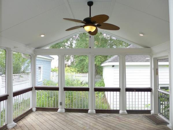 The raised screened porch offers a comfortable outdoor space with a vaulted ceiling with a ceiling fan. The screened porch leads out to the backyard and the detached two car garage behind the home.