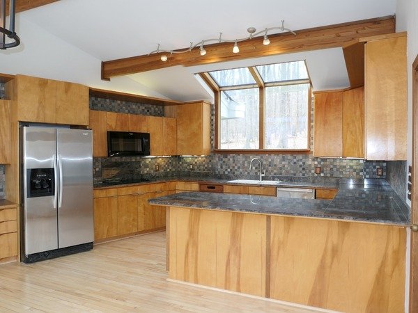 The combined kitchen and dining room are off the living room. There are skylight style windows in both of these areas. The kitchen features a tile backsplash, granite counters, wood and glass front cabinets, work desk, and under counter and over cabinet lighting. Kitchen appliances include a smooth top cook-top, cabinet wall oven, refrigerator, built-in microwave, and a dishwasher. The counter between the kitchen and dining space overhangs for a breakfast bar. The dining area leads out to both the deck and screened porch. The screened porch has a vaulted ceiling with a fan and exits to the deck. The deck continues as a walkway spanning the back side of the home; ending with stairs to the fenced side yard.