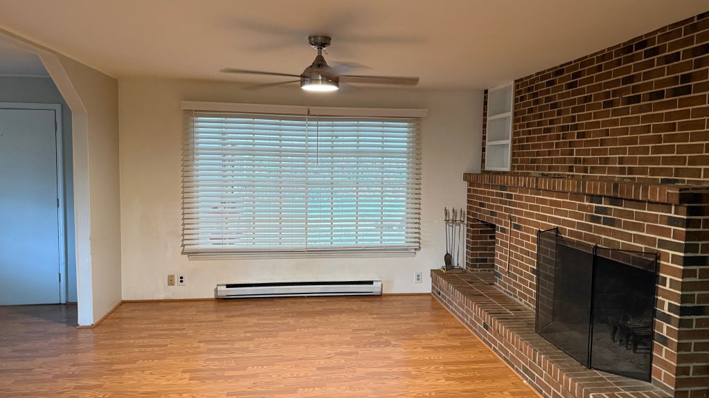 Large kitchen with new appliances, and lots of cabinet space. Large living room with brick wood-burning fireplace and built-ins. Dining area off kitchen with half bath. Upstairs two bedrooms with closets and additional storage areas. Landing has room for office or storage. Laminate wood flooring and vinyl throughout. Front porch for enjoyment along with field garden if you are so inclined. Quick and easy access to Laundry facility for convenience. Plenty of off-street parking. Two park and rides close by. Flat Fee of $100 for Utilities including pest control - but for internet / Cable. Non-smoking property. Email through ad or text, call for showing.
