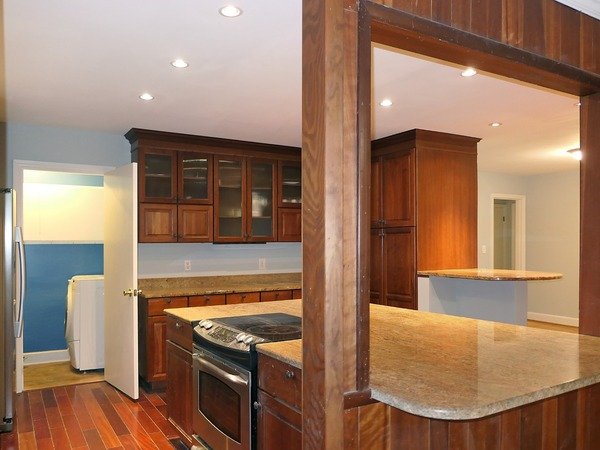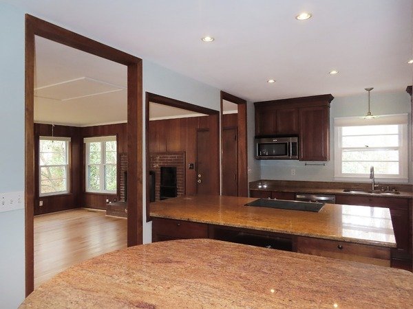 This home features hardwood flooring throughout, with tile in the bathrooms. Two walls of continuous windows fill the living room with natural light. The living room is detailed with wood paneled walls. There is a decorative (not available for use) fireplace in the living room. A small foyer with a walk in closet leads from the living room to the dining space. There is an additional side entrance door to the living room. The living room is open to the kitchen through a partial wall, and the dining room is open to the kitchen over a raised serving or breakfast bar.