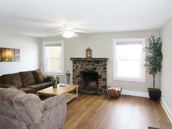The living room features a stone fireplace and ceiling fan. The dining room is convenient to the kitchen and living room. There are built in shelves in this room. There are plank floors throughout both levels of the home.