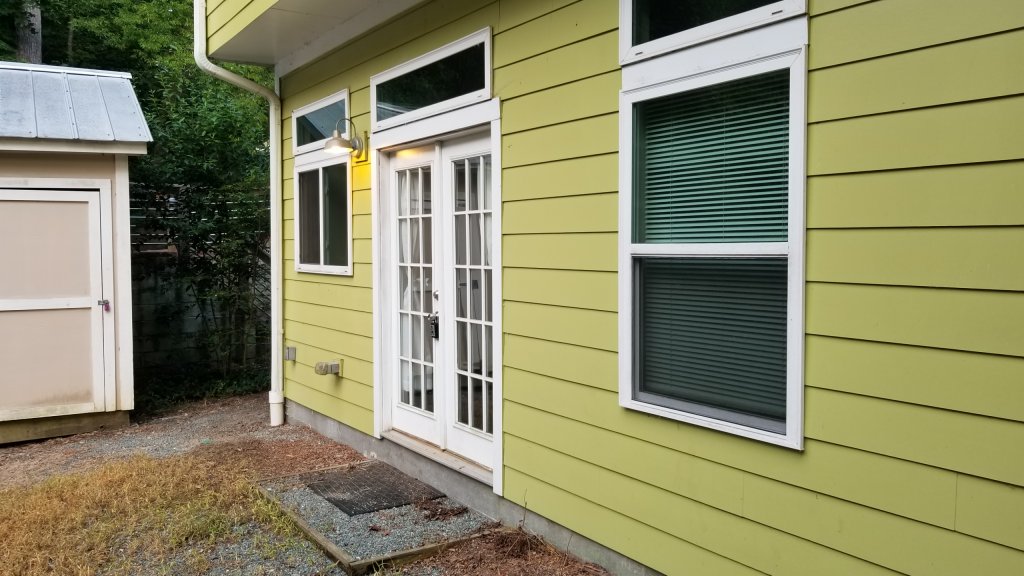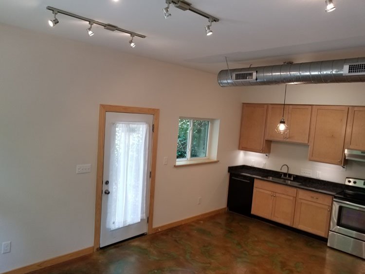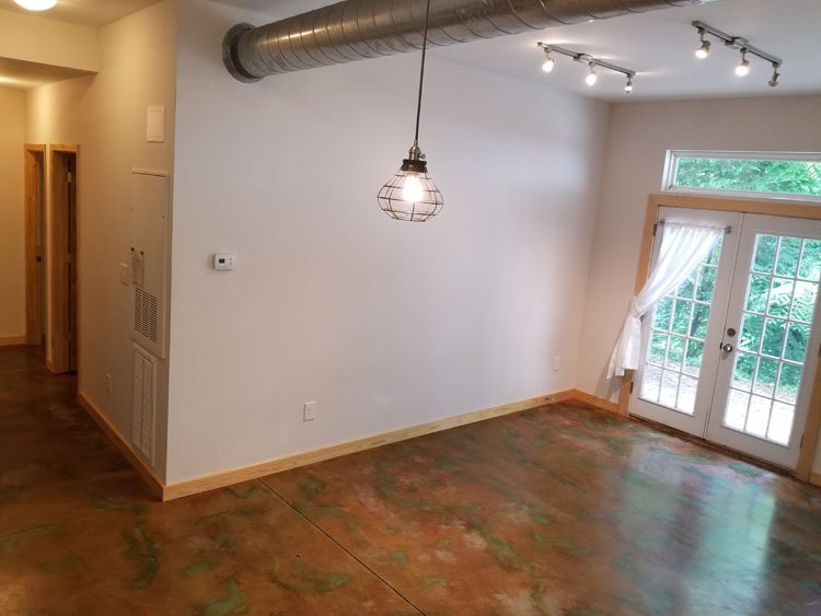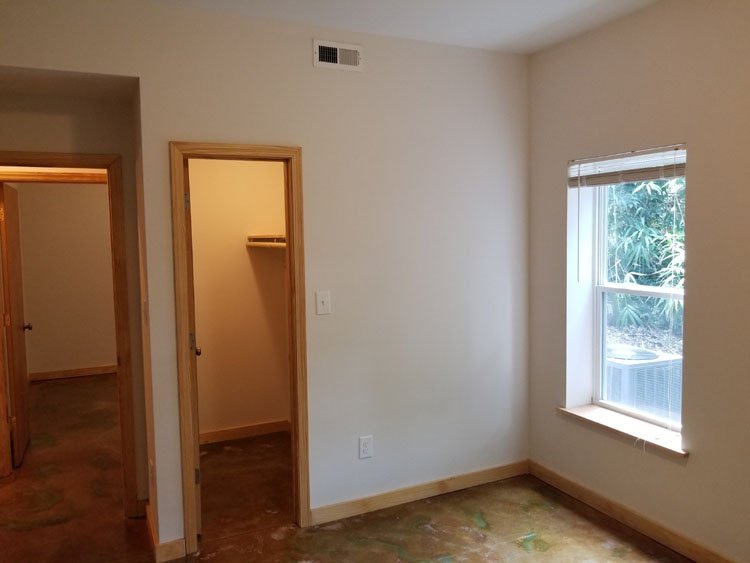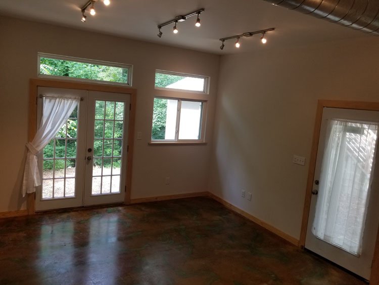 10 foot ceilings, clear story transom windows, acid washed flooring, French door walkout to wooded park, walking distance to UNC/medical school as well as nearby bus access (frequent "J", "D" and "NS" buses) and the famous Merritt's store.