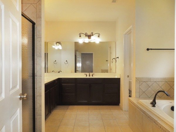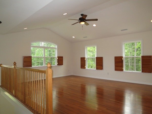 The bedroom and bonus are on the upper level. There are two stairways to the second level. The front foyer stairs lead up to the bedroom hallway, overlooking the entry below. The second stairway leads from the family room into the bonus room. The Bonus has a vaulted ceiling with a fan. All of the bedrooms have ceiling fans. The master bedroom has, two walk-in closets, and a private bathroom. The master bathroom features tile floors, two vanity areas, a soaker tub, and separate shower. There are three additional bedrooms. One bedroom has a ceiling fan and a walk-in closet. One bedroom has walk-in access to attic storage. The shared bath on this level includes a dual sink vanity.