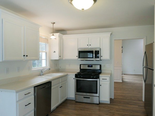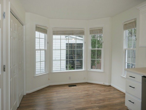 The kitchen features white cabinets, over cabinet lighting, a pantry closet and included appliances. The kitchen combines with the breakfast area. A bay window offers natural light. The laundry closet is also in this room and includes a washer and dryer. A half bath completes the main level of the home.
