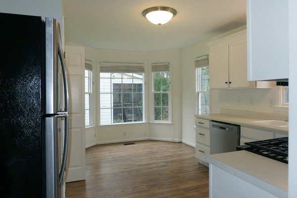 The living room, dining room, kitchen and breakfast area are on the main level - all with hardwood style laminate flooring. The living room features a fireplace and a ceiling fan there is an exit from the living room to the deck and fenced backyard. The dining room is convenient to both the living room and kitchen. This room features classic wainscoting and a bay window.