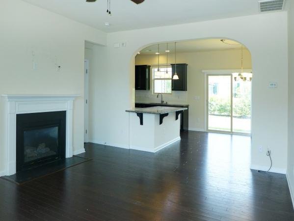 The home has hardwood floors on both levels. The Living room features a gas-log fireplace and a ceiling fan. The dining space is open to the kitchen over an overhanging breakfast or serving bar with pendant light. The kitchen features granite counter tops, a pantry closet, tile backsplash, recessed lights and stainless appliances. A glass slider leads to the patio area with a small fenced yard and a storage closet.