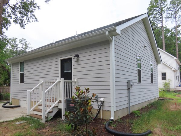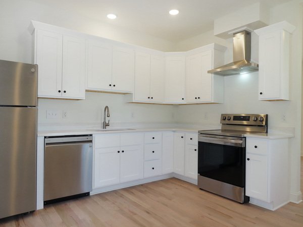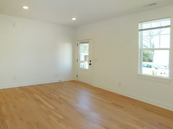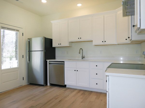 Entry from the front is into the living room. Windows fill the living room with natural light. The kitchen features stainless appliances, white cabinets, and granite countertops. There is room for a table in the kitchen. The kitchen provides the rear entry to the home, leading out to the parking area behind the house. There is hardwood style plank flooring in the living area and kitchen.
