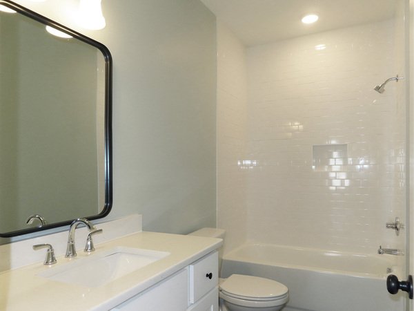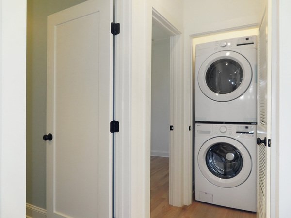 Both bedrooms have hardwood style plank flooring. The bathroom conveniently located to the bedrooms. There is tile flooring and a tile surround tub-shower in the bathroom. The home features recessed lighting throughout. A stacked washer dryer is located in the hallway closet.