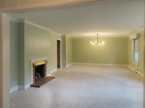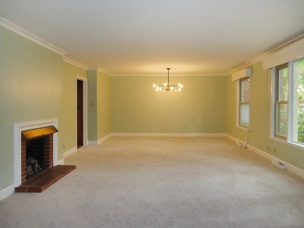 The combined living and dining areas are just off the entry foyer. This spacious room features a decorative (inoperable, not for use) fireplace in the living space. Large windows fill the room with natural light. This spacious room is detailed with crown molding. There is carpet in this room. There is a convenient entry between the dining area into to the kitchen.