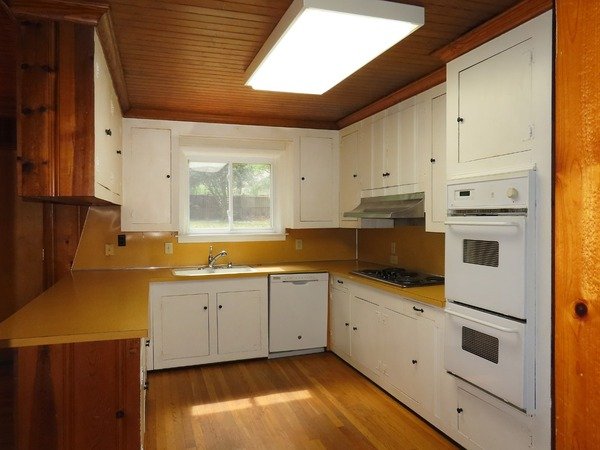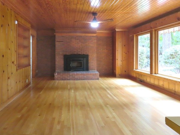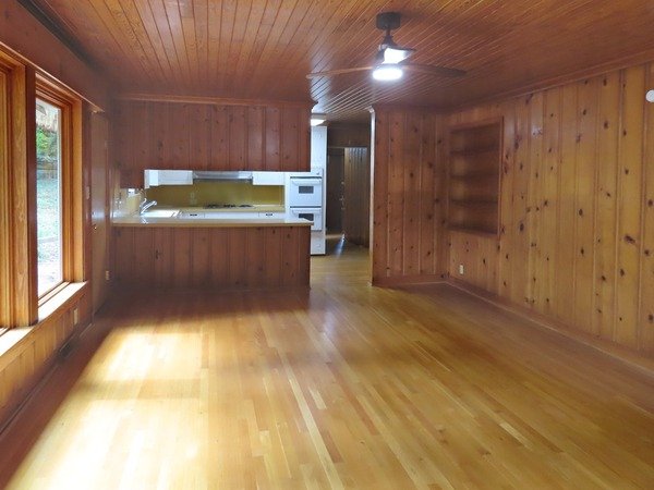 The family room is open to the kitchen through an over counter - under cabinet passthrough. There are hardwood floors, wood beadboard ceilings, and wood panels walls in the family room and kitchen. The family room features two built-in bookshelves, a ceiling fan, and a decorative woodstove (inoperable- not for use). The kitchen includes a cook-top, refrigerator, double wall oven, and dishwasher. There is a double door pantry in the adjoining rear hallway. A cubby on the hallway includes a stacked washer and dryer.