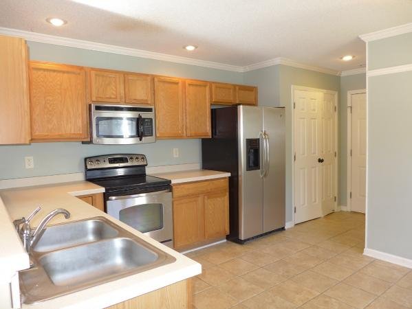 The living and dining areas combine and are open to the kitchen over a raised serving counter. This spacious room has hardwood flooring. There is a ceiling fan in the living space and a glass slider exits to the patio in back. The kitchen has tile flooring, ample cabinet space, a large pantry closet, stainless appliances, and a breakfast nook. The utility room is just off of the kitchen and includes a washer and dryer and a large closet. A large under stairs storage closet and a half bathroom complete the main level.