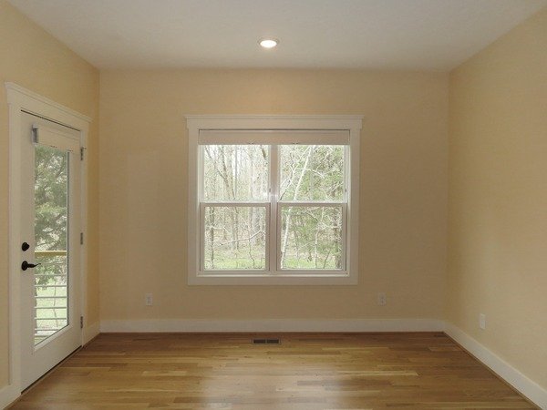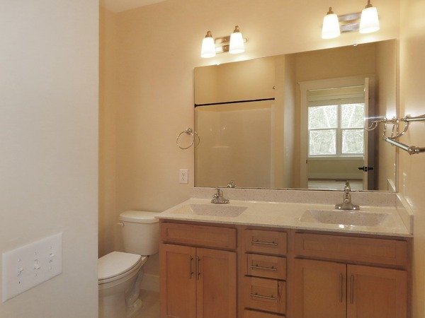 The master bedroom is on the main level. This bedroom has direct access to the porch, recessed lighting, a walk-in closet, and a private bathroom. The bathroom has tile floors, a shower and a dual sink vanity. A half bathroom completes the main level.