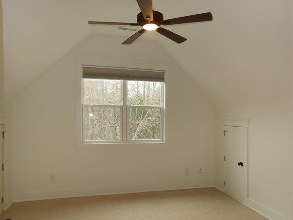 There are two bedrooms on the upper level, one overlooks the front common area, the other overlooks the woods in back. Both bedrooms have vaulted ceilings and a fan. One bedroom has a corner closet with shelving, the other has a walk-in closet. A loft and the bathroom on this level are between the bedroom. There is built in shelving in the loft. There is cork flooring in the bedrooms and the loft. This bathroom has tile flooring and a tub-shower.
