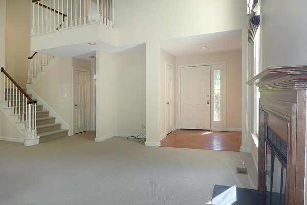 This end-unit townhome in Fearrington Village features an open and airy living room with a vaulted ceiling and skylights, and a gas-log fireplace. The living room is open to the dining space, both with have carpet. There is an exit from the living room to the screened porch. The screened porch features a vaulted ceiling with a fan, brick floor.