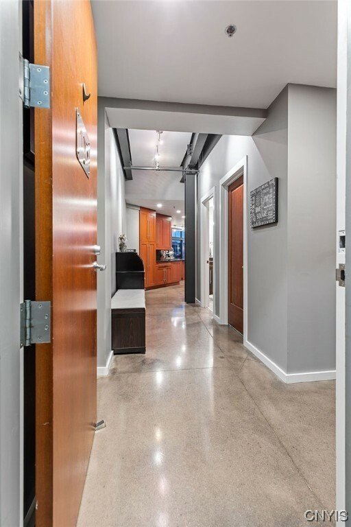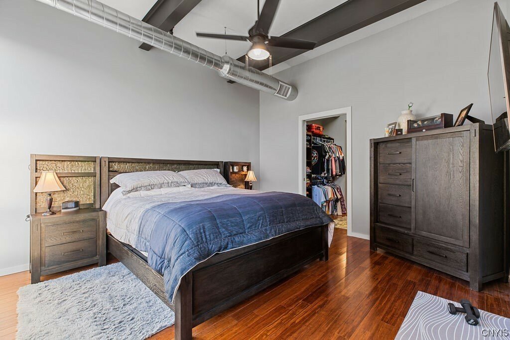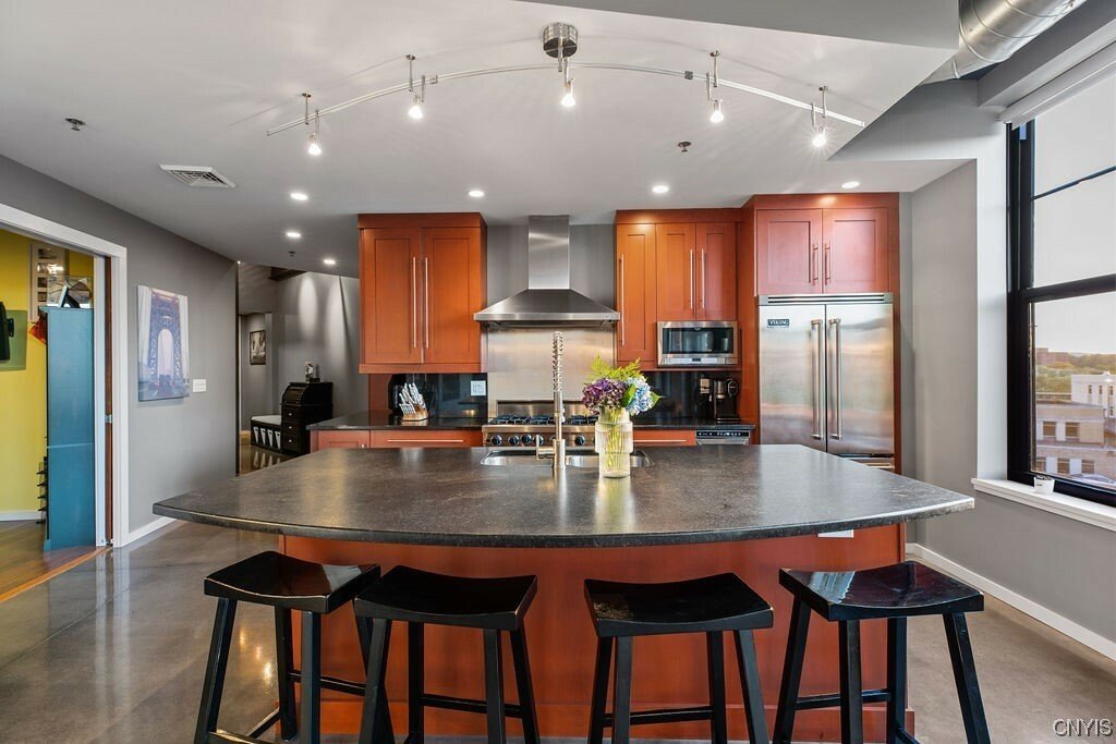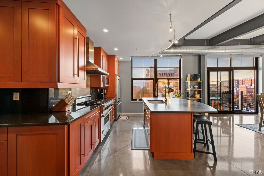 Come take a step inside of this luxury Condominium, located in the heart of Downtown Syracuse. With some of the best views of Armory Square, this beautiful corner condo sits atop the fourth floor of the Costello building. Showcasing immaculate sunsets, the views are second to none. Enter your private condo which includes 1800+ sq ft, 2 bedrooms, 2 full baths, a walkout balcony and more! With industrial finishes and an open concept kitchen and dining/family room, this home is set for entertaining! With granite counter tops, a large island and top of the line Viking appliances, your next dinner party awaits! The primary suite is accompanied by an oversized closet, followed by a double vanity and walk in shower. The second bedroom offers an area for an ample in-home office space alongside a Murphy bed for your guests. Find comfort in your new home with top of the line security within the entire building/underground parking garage, intercom and key fob entry. With close proximity to restaurants, shops, entertainment and more, find yourself immersed in all that Syracuse has to offer. It's a pet friendly home but must be well trained ones that don't destroy.