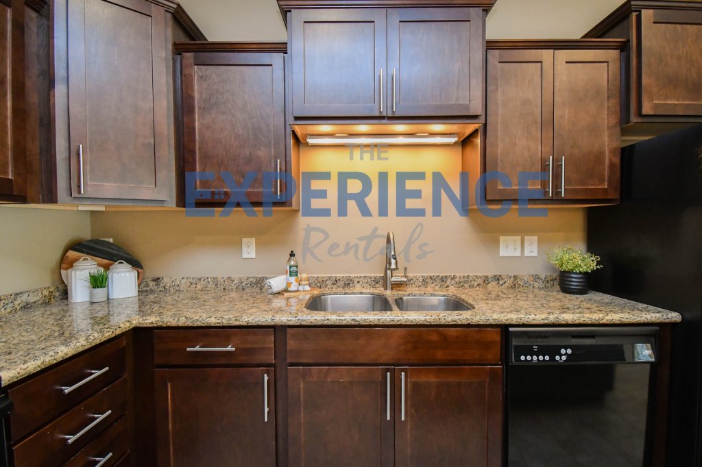 This beautiful 1-bedroom, 1-bathroom condo at Heartland Fields offers a spacious, open-concept layout with a large kitchen and living area featuring elegant tray ceilings and a walk-out balcony. The kitchen boasts dark wood cabinets, granite countertops, black appliances, and a convenient eat-in peninsula. The generously sized bedroom includes a walk-in closet with built-in shelving for added storage. Enjoy the convenience of a single-car garage, while water, garbage, and lawn/snow care are included in rent. Tenants are responsible for gas and electricity in this high-efficiency unit.