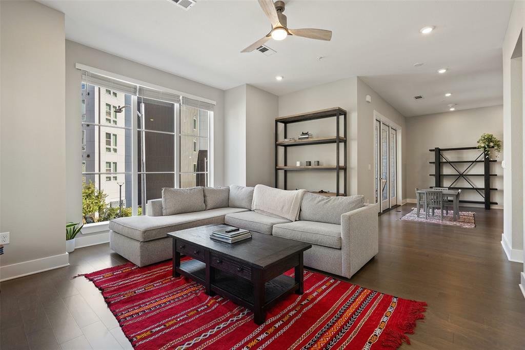 Say hello to this chic second-floor condo at The Grove: where convenience meets elevated Austin living. Ideally located just minutes from Downtown, you’ll enjoy easy access to the city while being tucked away from the hustle and bustle in one of Austin’s most charming and walkable communities. Step inside to a beautifully designed kitchen featuring sleek quartz countertops, high-end Bosch stainless steel appliances, and a breakfast bar perfect for morning coffee or casual dining. The open layout flows seamlessly into a spacious dining area, making it easy to entertain while staying connected. The primary suite offers a true retreat with a spa-inspired bathroom complete with an upgraded walk-in shower, dual quartz vanities, and a generous walk-in closet with ample storage. A versatile second bedroom provides the perfect space for guests, a home office, or a gym. Enjoy the convenience of an in-unit washer and dryer, making everyday living effortless. Beyond your front door, The Grove community offers an unbeatable lifestyle with scenic jogging trails, curated dining options, and a vibrant retail center, all within walking distance. Residents also enjoy access to the stunning 5th-floor pavilion, featuring a full kitchen, lounge seating, and an expansive outdoor space with a grill: perfect for taking in breathtaking views of Downtown Austin and the surrounding green space. Unit comes with 1 parking space in the secured parking garage below! Reach out today for more information or to schedule a showing!
