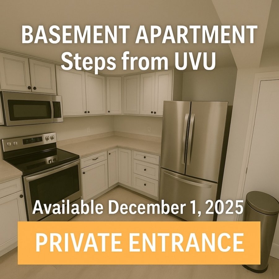 Ideal Basement Apartment with Private Entrance — Perfect for a Couple, One Student, or Two Students (preference given to students)Available: December 1, 2025Enjoy comfortable living in a prime location right next to UVU — just a 10-minute walk (or 2-minute drive) to most of campus, with quick access to BYU, I-15, shopping, dining, entertainment, and public transportation.Features:Private entrance for added privacy Two included on-site parking spots + plenty of public parking nearbyOne-car garage available/negotiable$150/month flat fee for Wi-Fi &; utilities (1 person) or $180/month (2 people)Pets:This is an owner-occupied home, so no dogs or cats. Other pets may be considered.