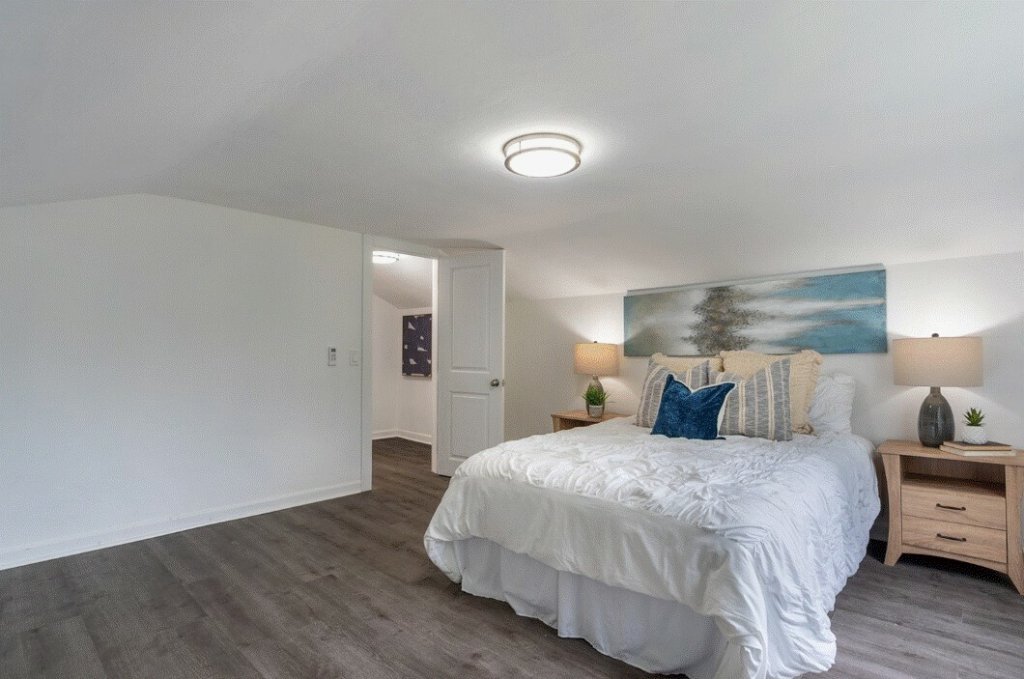 The larger bedroom accommodates a queen bed and seating area, while the second bedroom offers a cozy and efficient layout.