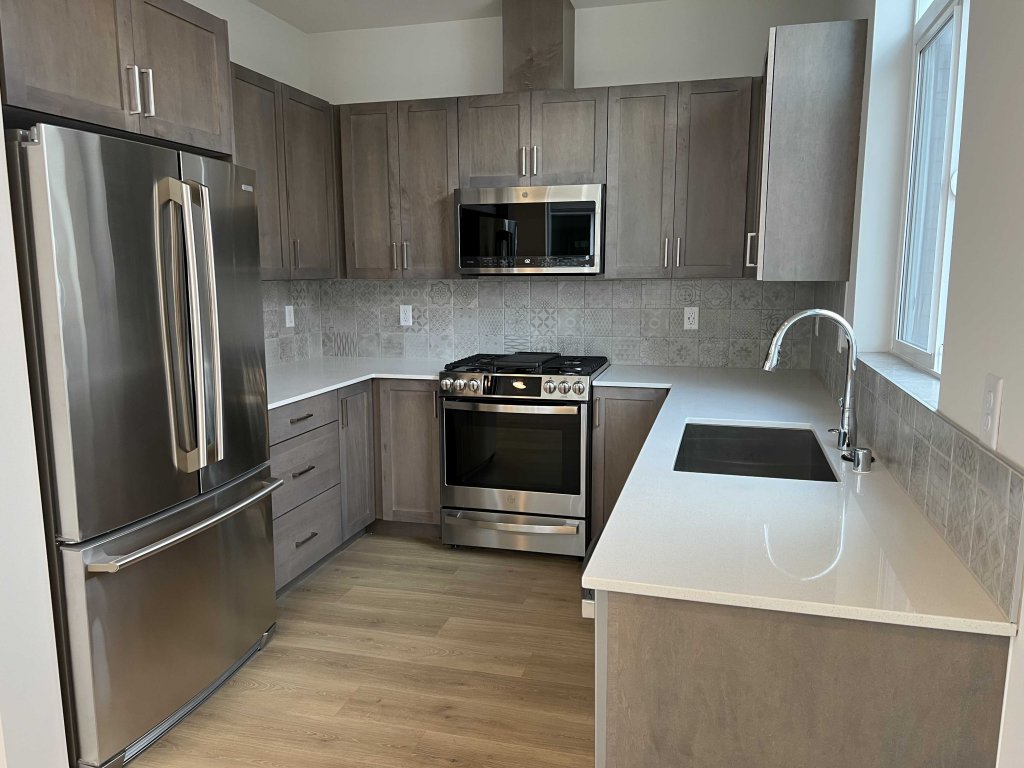 - Stainless steel gas range, micro, fridge, and dishwasher
